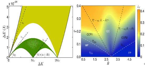 右:该模型模型的比热临界相图--QC代表量子临界区,TLL代表朝永-拉亭戈液体, COR是非相干拉亭戈液体区(incoherent Luttinger liquid),那里电荷自由度是相干的,自旋不再具有声速。