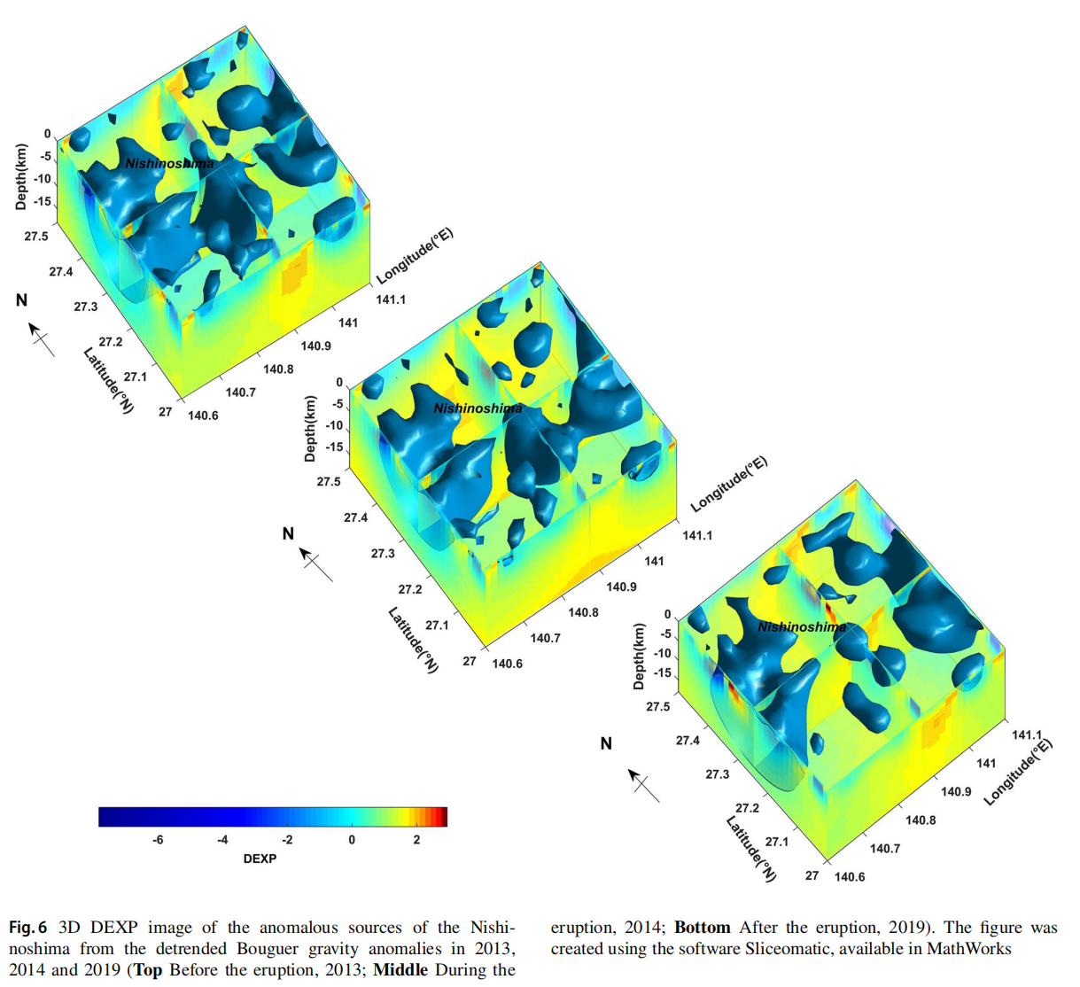 “地球的历史就是火山的历史”。火山的成因与板块运动有关,发现火山、分析火山,有助于科学解答板块运动“原动力”,以及拓展地幔对流、大洋中脊、大陆边缘张裂和热点的研究。海底火山活动的特殊性,使得传统火山监测手段无法适用,大量海底火山活动未能准确掌握。针对海底火山活动这一典型区域地球动力学现象,研究团队提出利用大地测量精准定量的技术优势,顺利获得多周期海洋重力场重复观测资料,探测地球表层典型区域质量快速迁移现象——海底火山喷发过程中的岩浆活动特征。以日本西之岛海底火山活动为例,研究团队利用DEXP三维成像技术,对火山内部岩浆分布进行快速成像,并顺利获得对应于火山喷发前、中、后三个时期的成像结果对比,分析其岩浆运动。研究成果揭示了火山喷发岩浆运动的复杂特性,既有侧向的岩浆运输,也有垂直的岩浆运动。西之岛地下岩浆库是由位于西之岛东、西两侧更大、更深的岩浆系统侧向输送而来,该区域侧向岩浆运动方向与太平洋板块向西朝菲律宾海板块俯冲运动方向一致,岩浆的聚集可能是由于太平洋板块上海底山HIMU富集物质(即高Nb/Zr和Ta/Hf)的加入,这些物质正向西俯冲到菲律宾海板块之下,洋底板块运动是火山喷发的主要动力;垂向上,火山喷发活动期,东部岩浆库剧烈变化,特别是东北部的岩浆库随火山爆发先减少后明显增加,地下岩浆库的深度从1.8 km变浅至1.4 km,最终深度约为1.3 km,东北部岩浆囊是火山喷发物质的主要供给源,岩浆的持续显著聚集意味着该区域火山活动未来几年仍处于活跃状态。