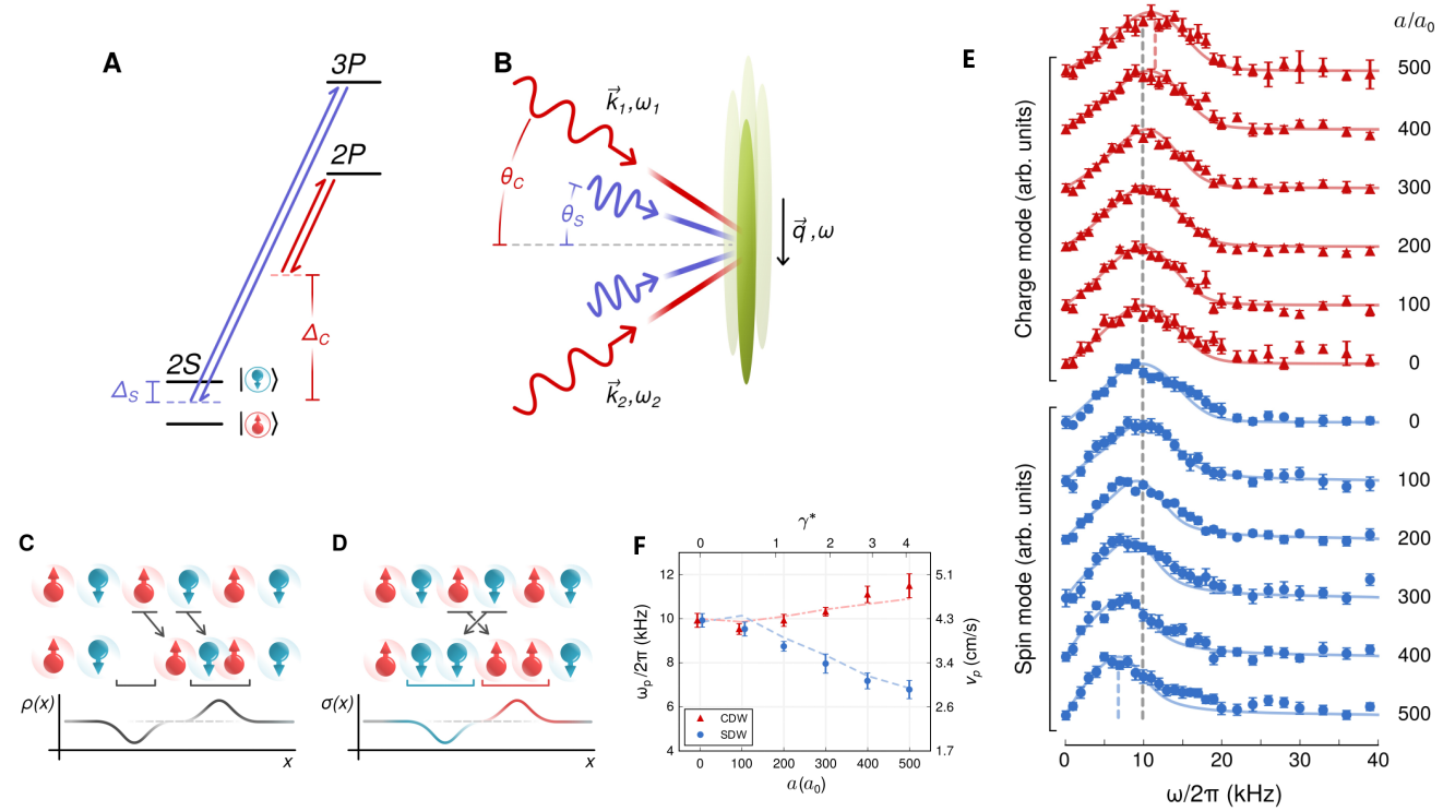 2020年至今,研究团队进一步合作顺利获得囚禁一维超冷原子实验成功地验证了这一重要的量子多体物理的普适规律。在囚禁的一维超冷6Li费米原子中,他们对电荷DSF的测量选择了精细能级|1> and |2> (|F = 1, MF = ±1/2)作为自旋态,2P3/2态为激发态,对自旋DSF的测量选择了精细能级|1>  and |3> 作为自旋态,3P3/2态为激发态,参见图二(A-D)。他们顺利获得布拉格光分别激发电荷与自旋密度波,并调控不同相互作用强度测量出其相应的电荷和自旋的布拉格谱,参见图二(E)。在不同相互作用下布拉格谱的峰值给出了相应的电荷和自旋的传播声速,参见图二(F)。在理论方面,他们顺利获得复杂的三维粒子数分布取得了一维管状系统中的密度分布,再进一步利用一维相互作用费米气体杨-高丁模型精确解和朝永-拉亭戈液体理论精确计算了囚禁冷原子电荷与自旋的DSF。考虑了电荷激发谱中的曲率修正和自旋激发谱中的反向散射引起的非线性效应后,理论与实验结果非常吻合。这在国际上首次顺利获得超冷原子实验验证了自旋-电荷分离现象的朝永-拉亭戈液体理论,并给出非线性拉亭戈液体理论的有力证据。本项工作不但展现了量子多体物理中的典范,并且为将来基于原子分子和光物理的精密测量科技给予了新的思想。