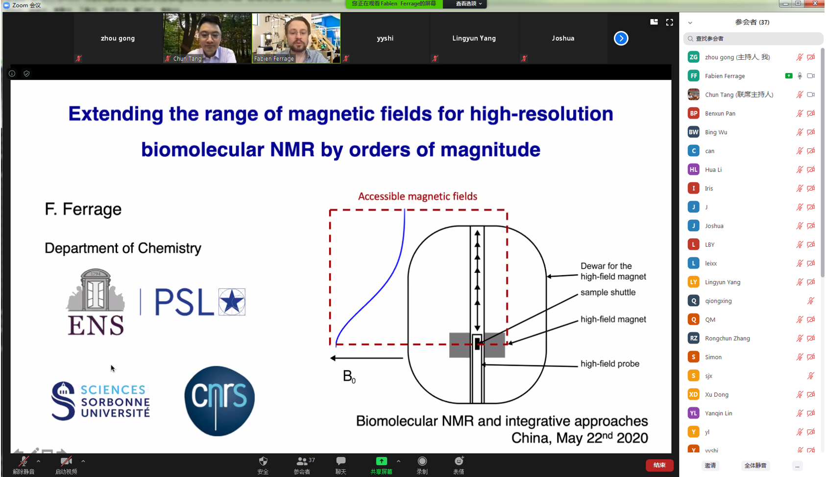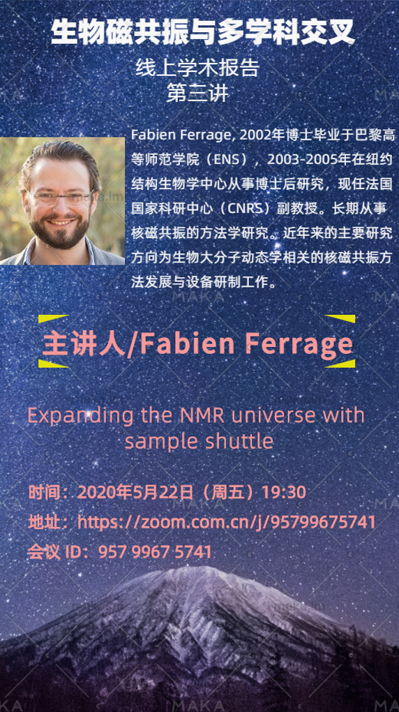 5月22日晚7:30,应巅峰国际唐淳研究员的邀请,法国国家科学研究中心(CNRS)Fabien Ferrage教授在线上平台做了题为“Expanding the NMR universe with sample shuttle”的学术报告。